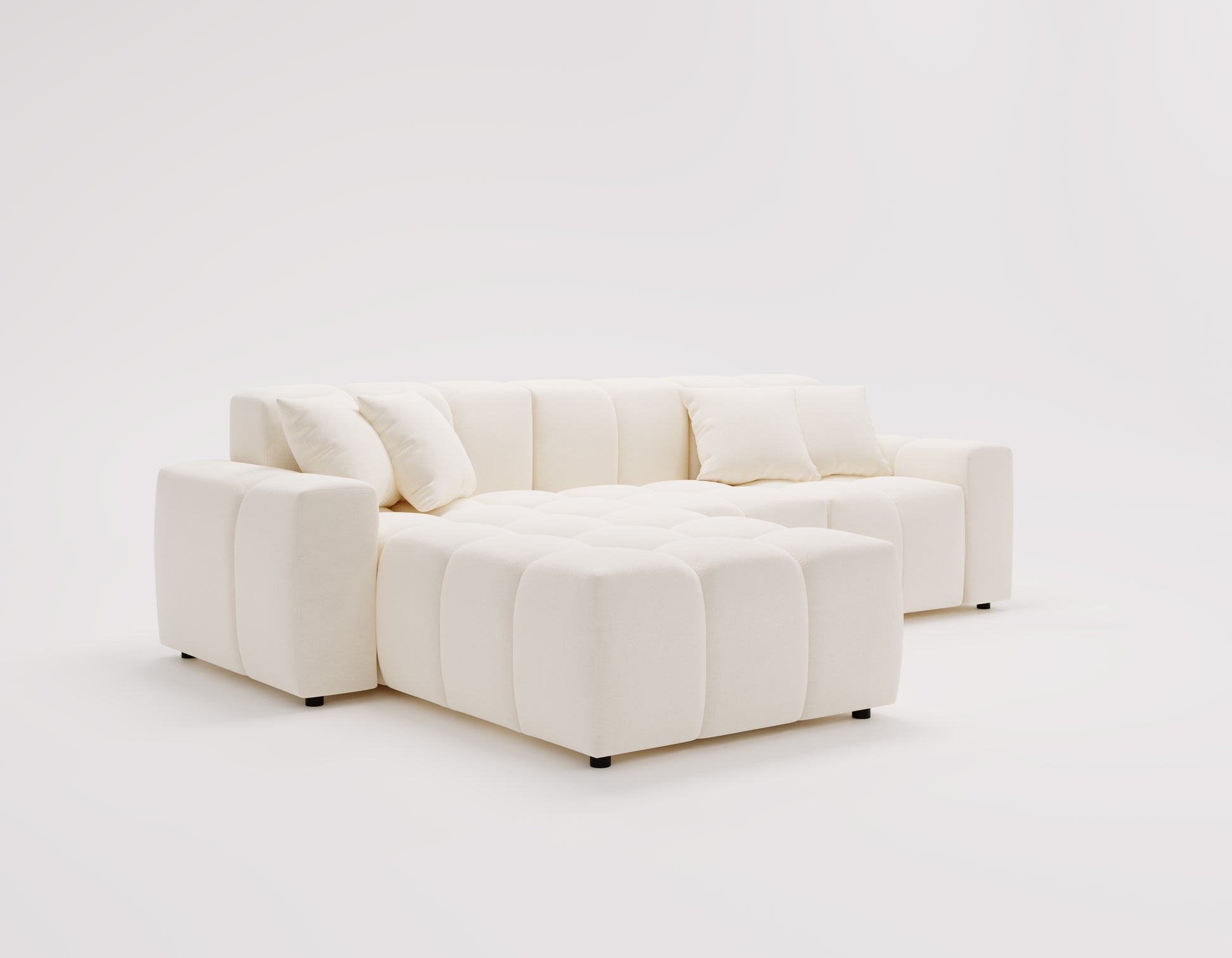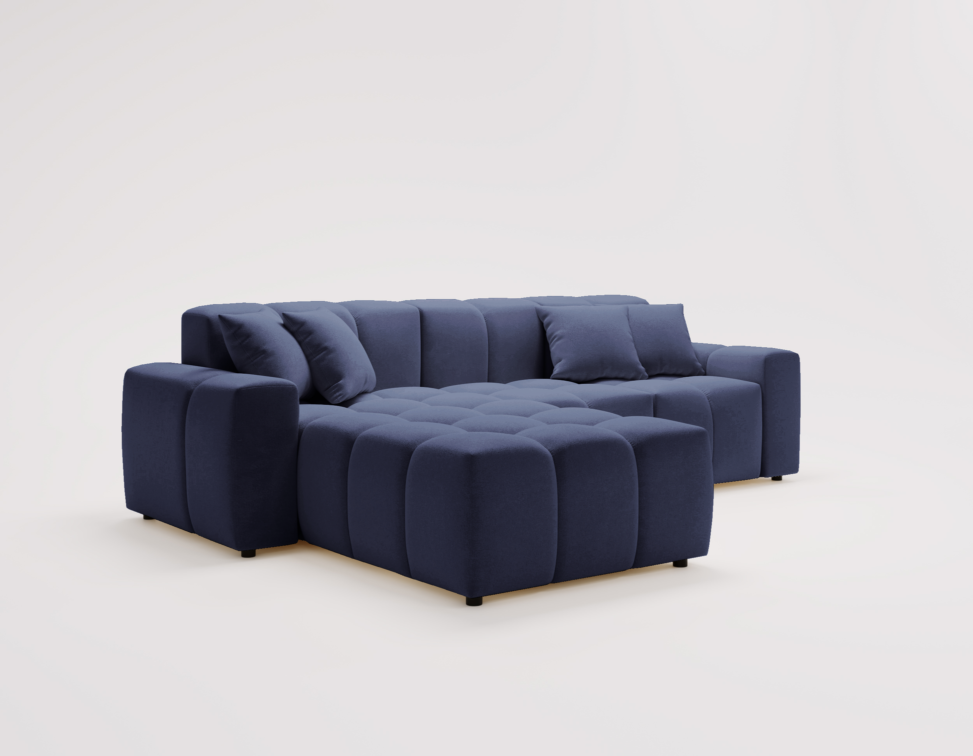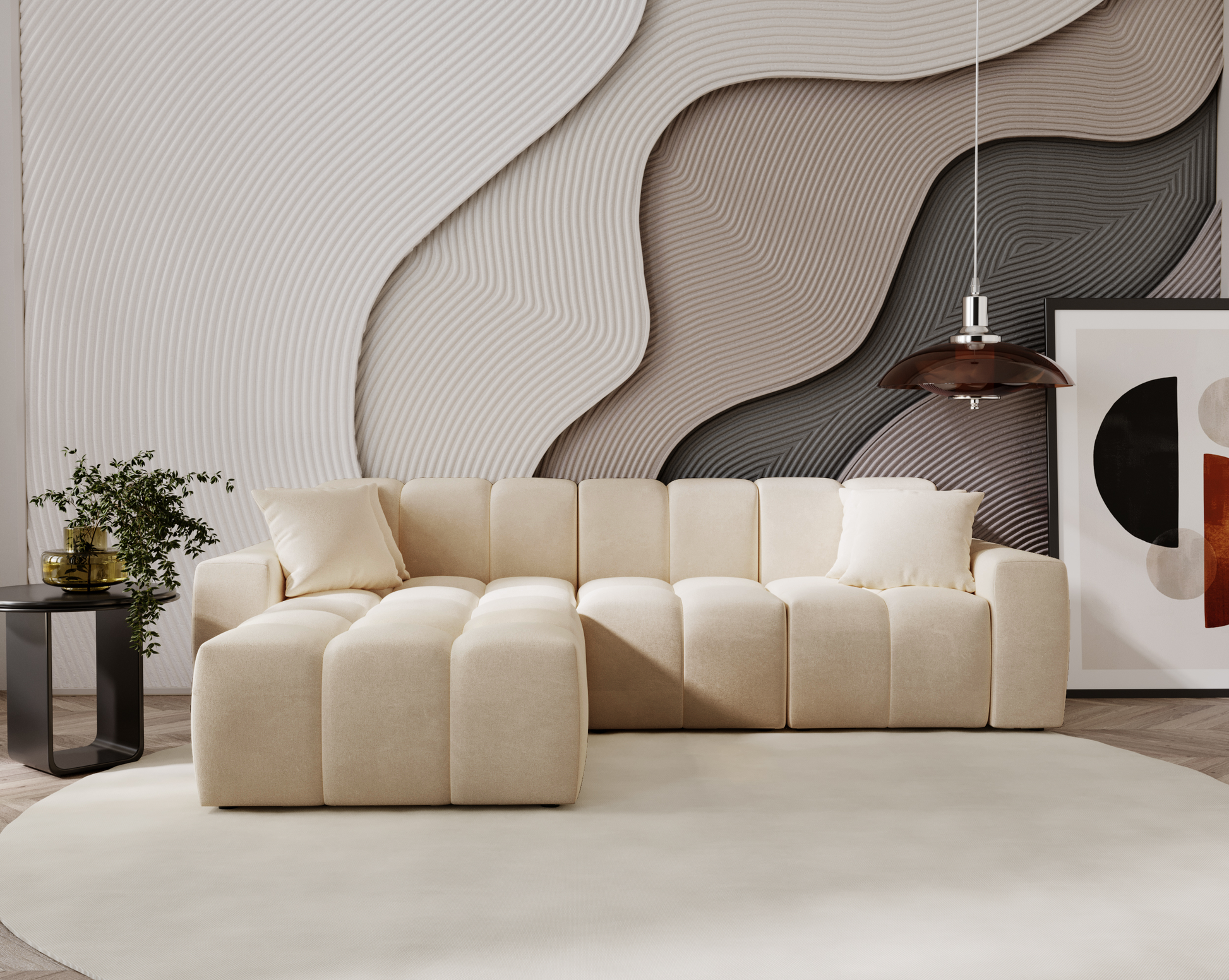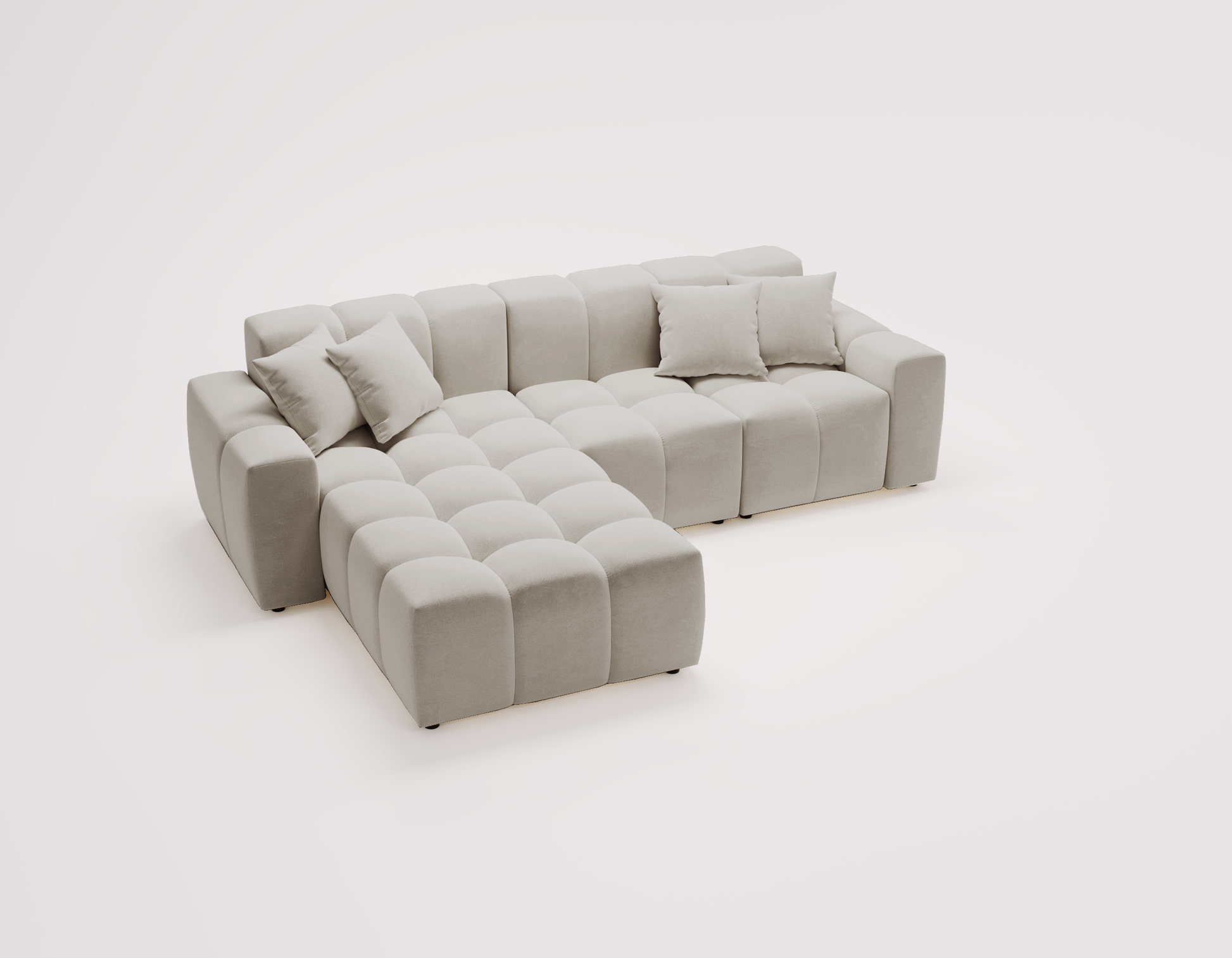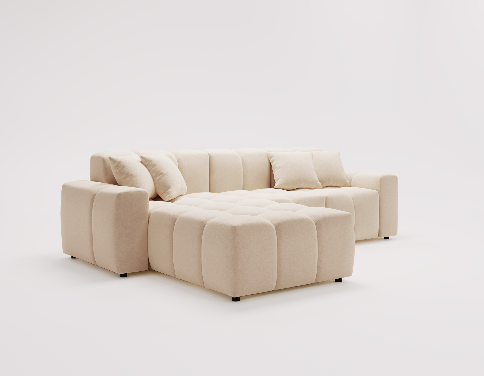 Molnet är en stilren och modern hörnsoffa som passar perfekt in i alla typer av vardagsrum. Den kännetecknas av sin minimalistiska, geometriska form samtidigt som den erbjuder en mjuk och bekväm sittupplevelse. Sitsen och ryggstödet är tillverkade av HR-skum och vågfjädrar, vilket garanterar hållbarhet och förhindrar att soffan tappar sin form över tid. Den ger maximal komfort – perfekt för dig som har höga krav på både design och funktion.