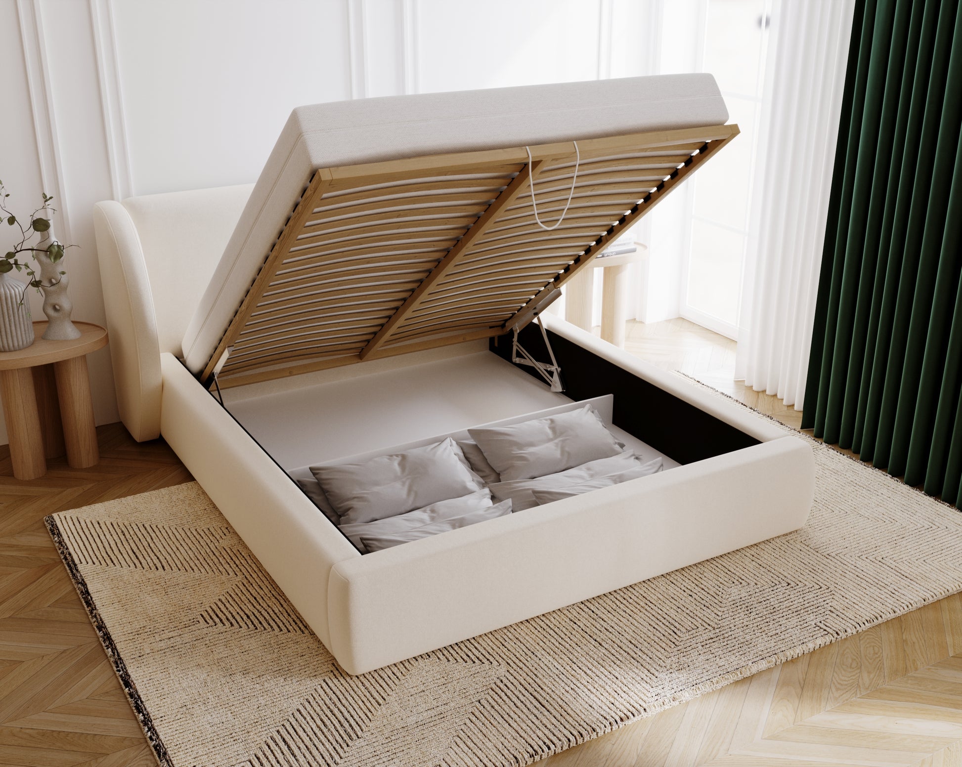 Förvaring under sängen med fjädrat lyftsystem