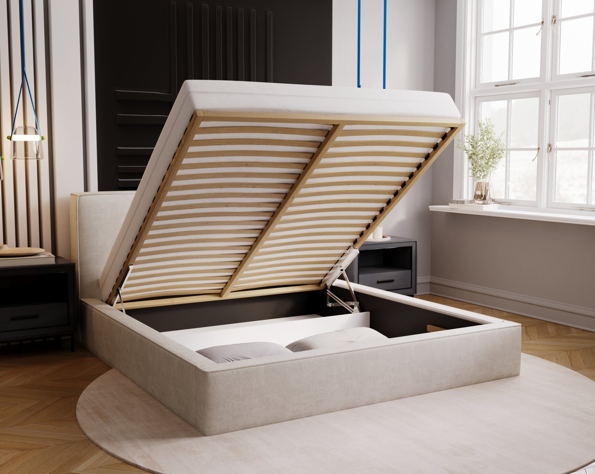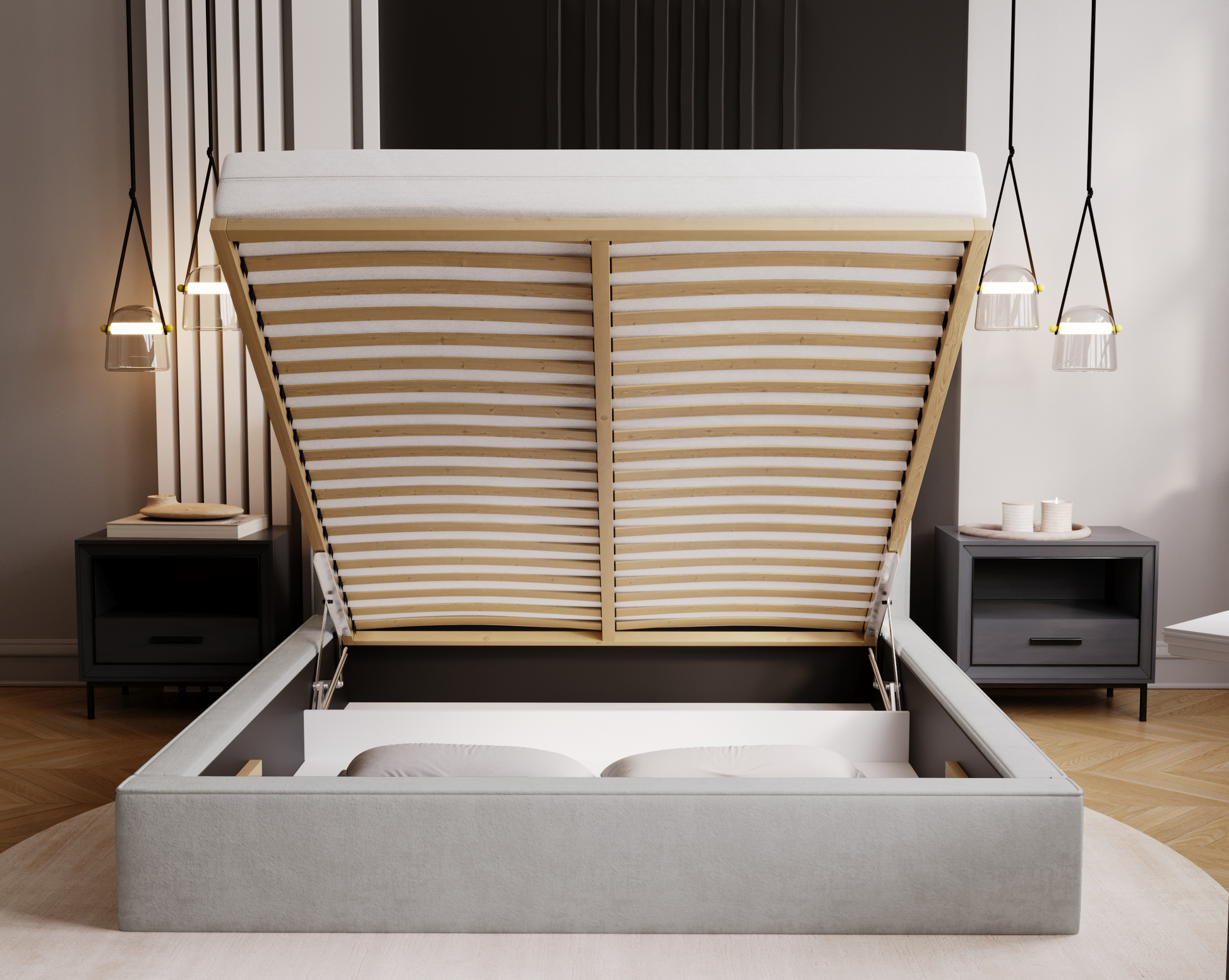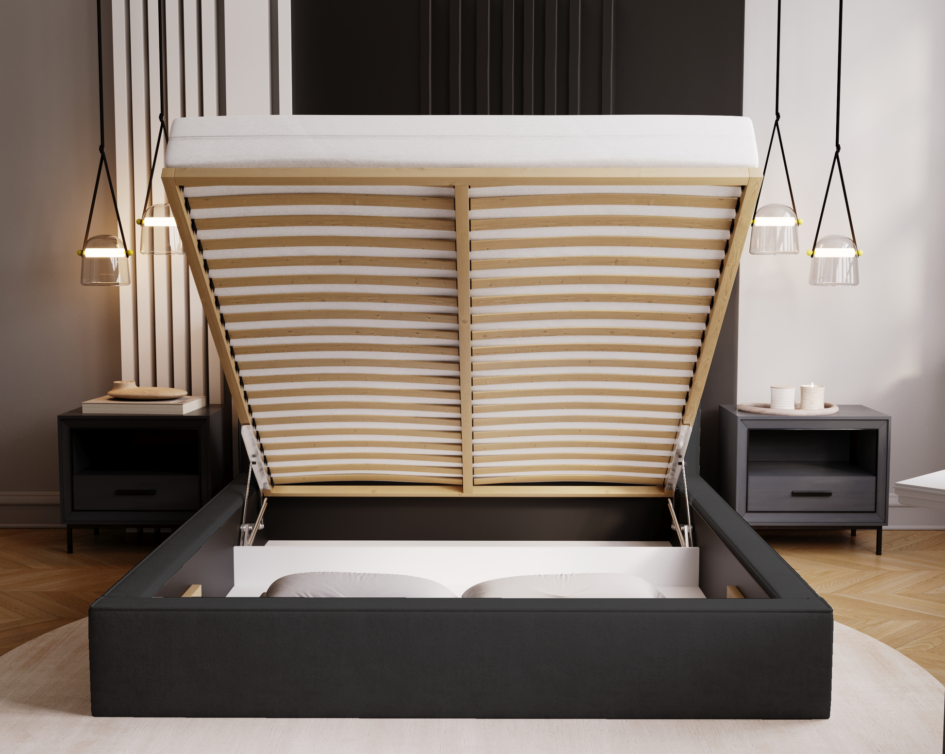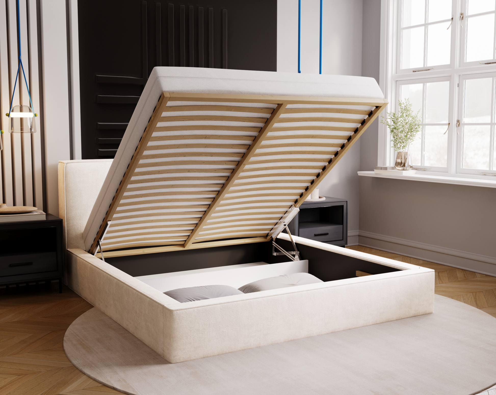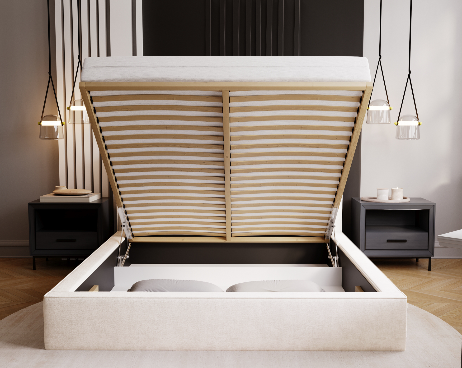 Under madrassen gömmer sig en rymlig förvaringslösning – perfekt för att hålla ordning på extra täcken, sängkläder och annat du vill ha nära men inte synligt. Med sitt enkla lyftsystem når du enkelt det du behöver.