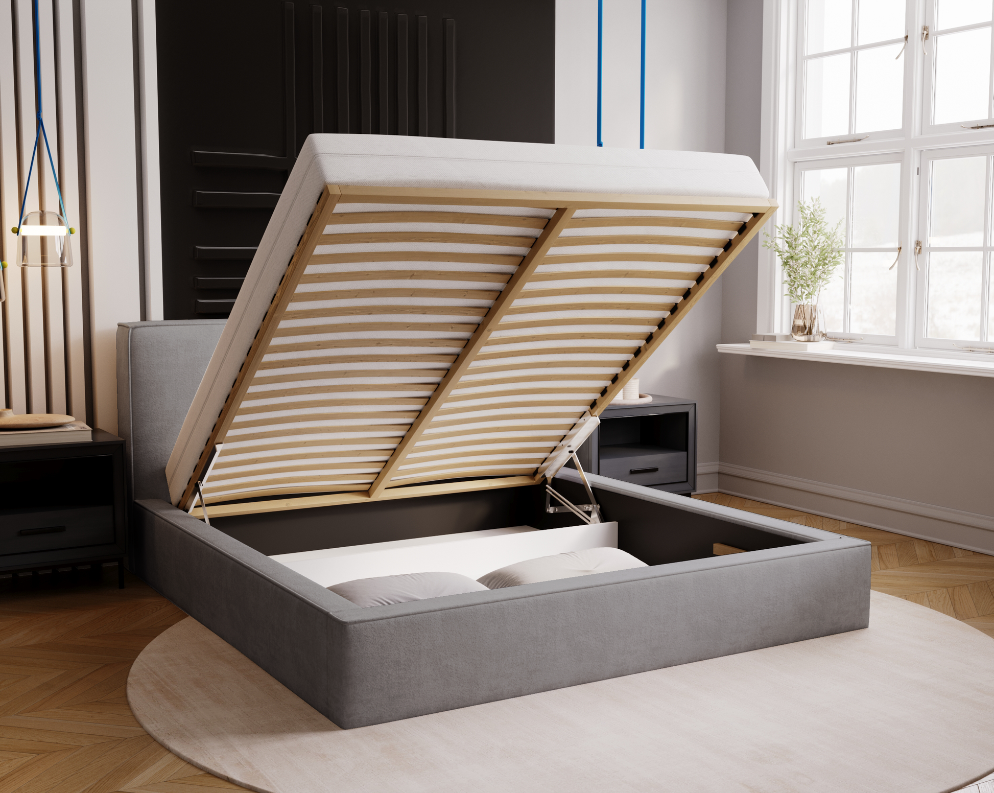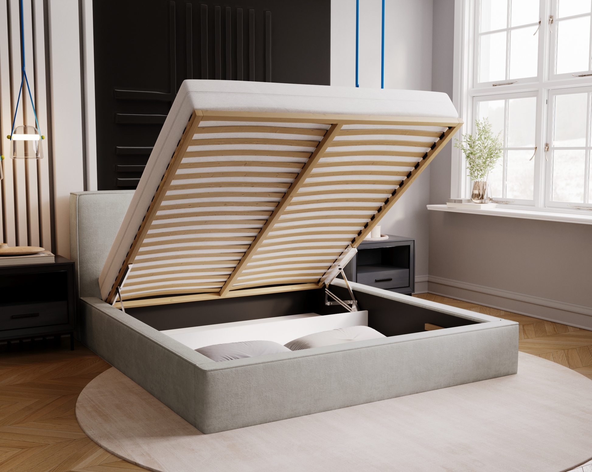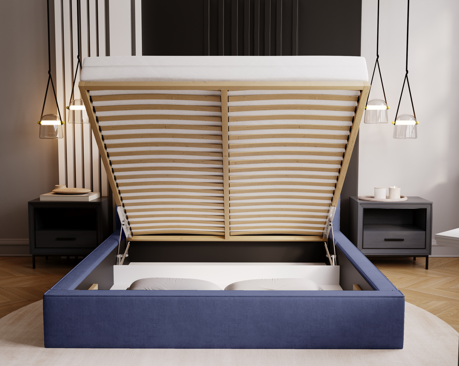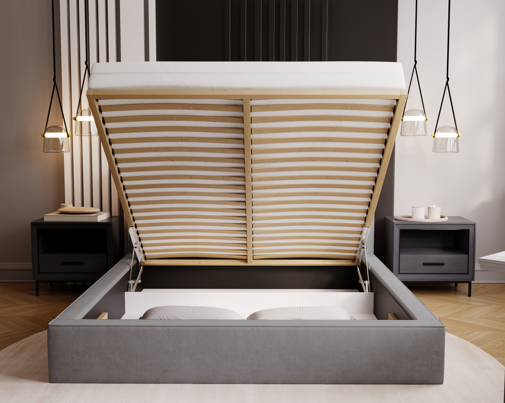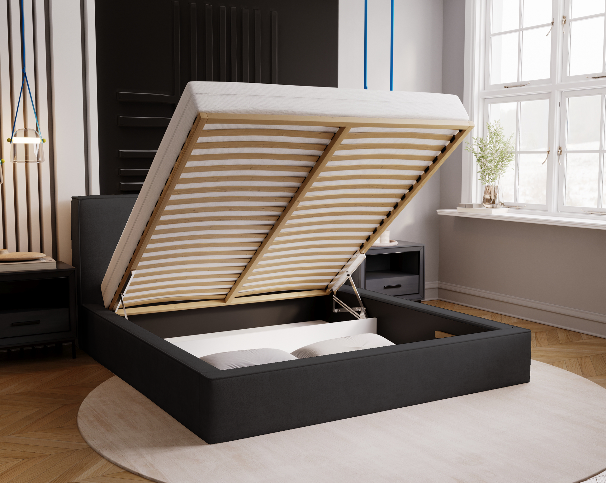Under madrassen gömmer sig en rymlig förvaringslösning – perfekt för att hålla ordning på extra täcken, sängkläder och annat du vill ha nära men inte synligt. Med sitt enkla lyftsystem når du enkelt det du behöver.
