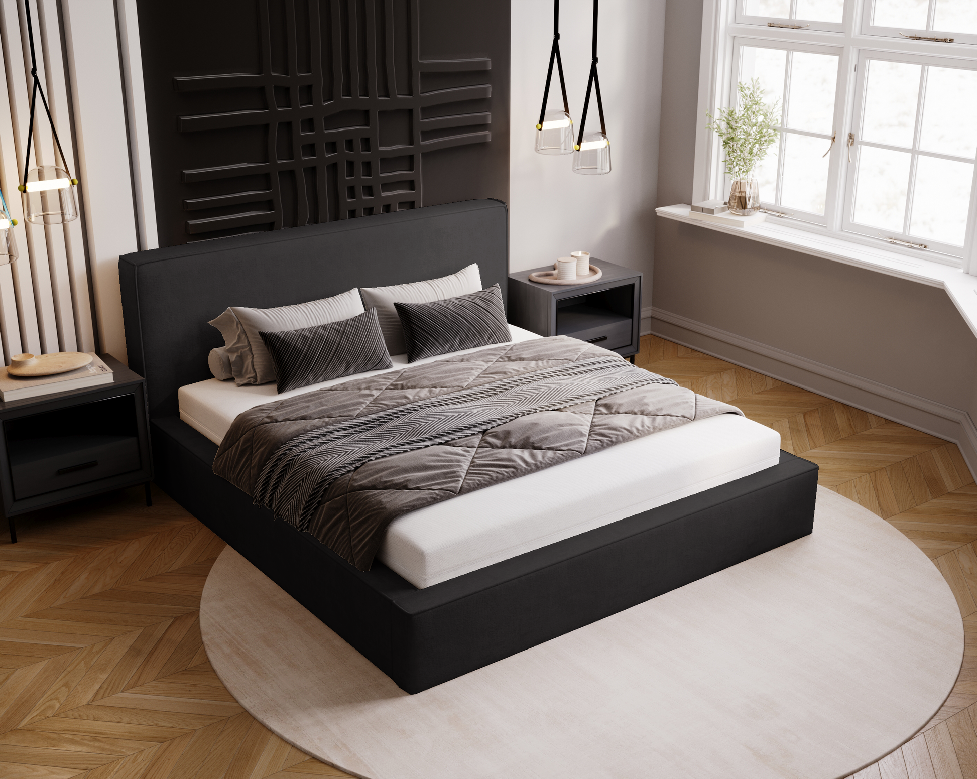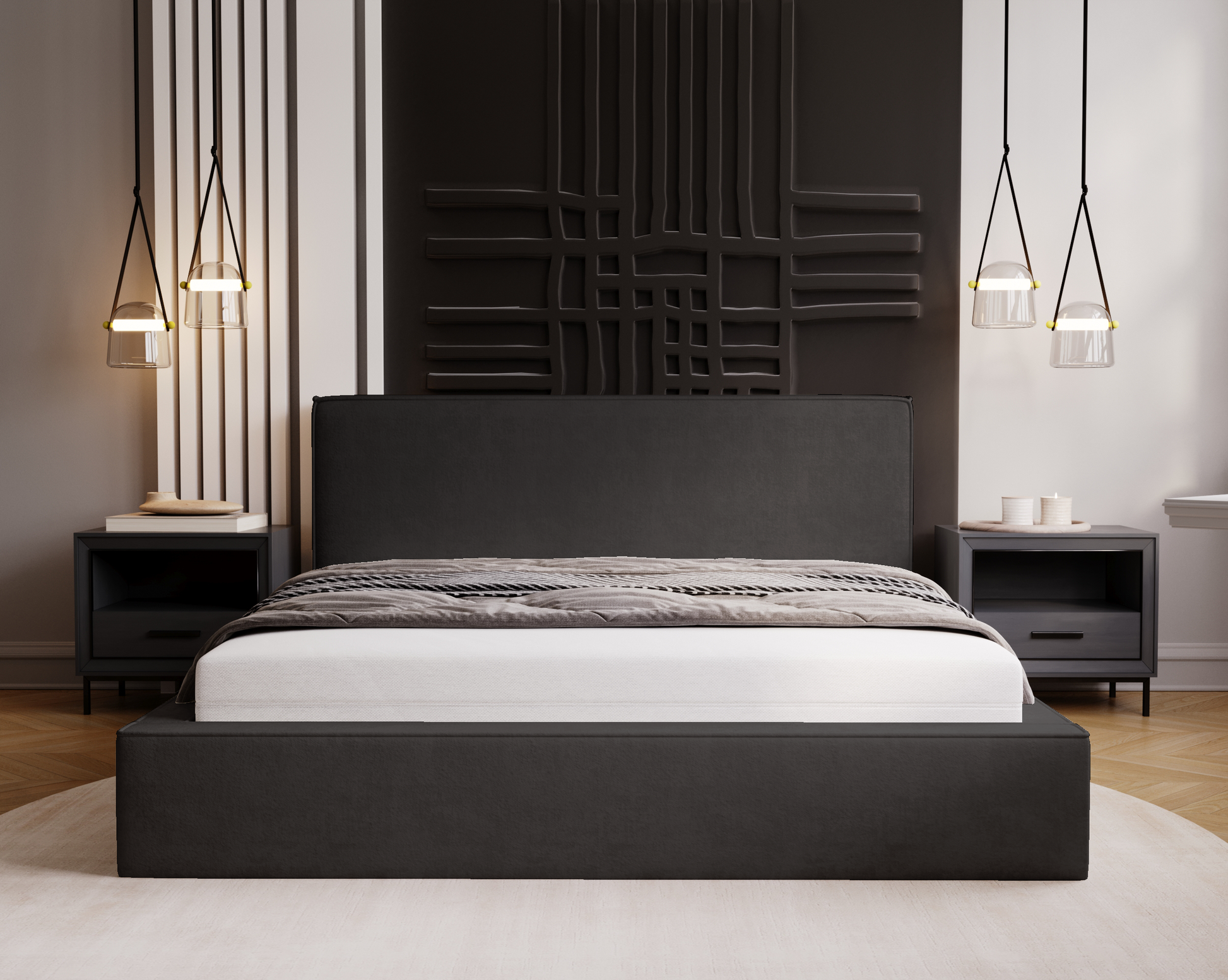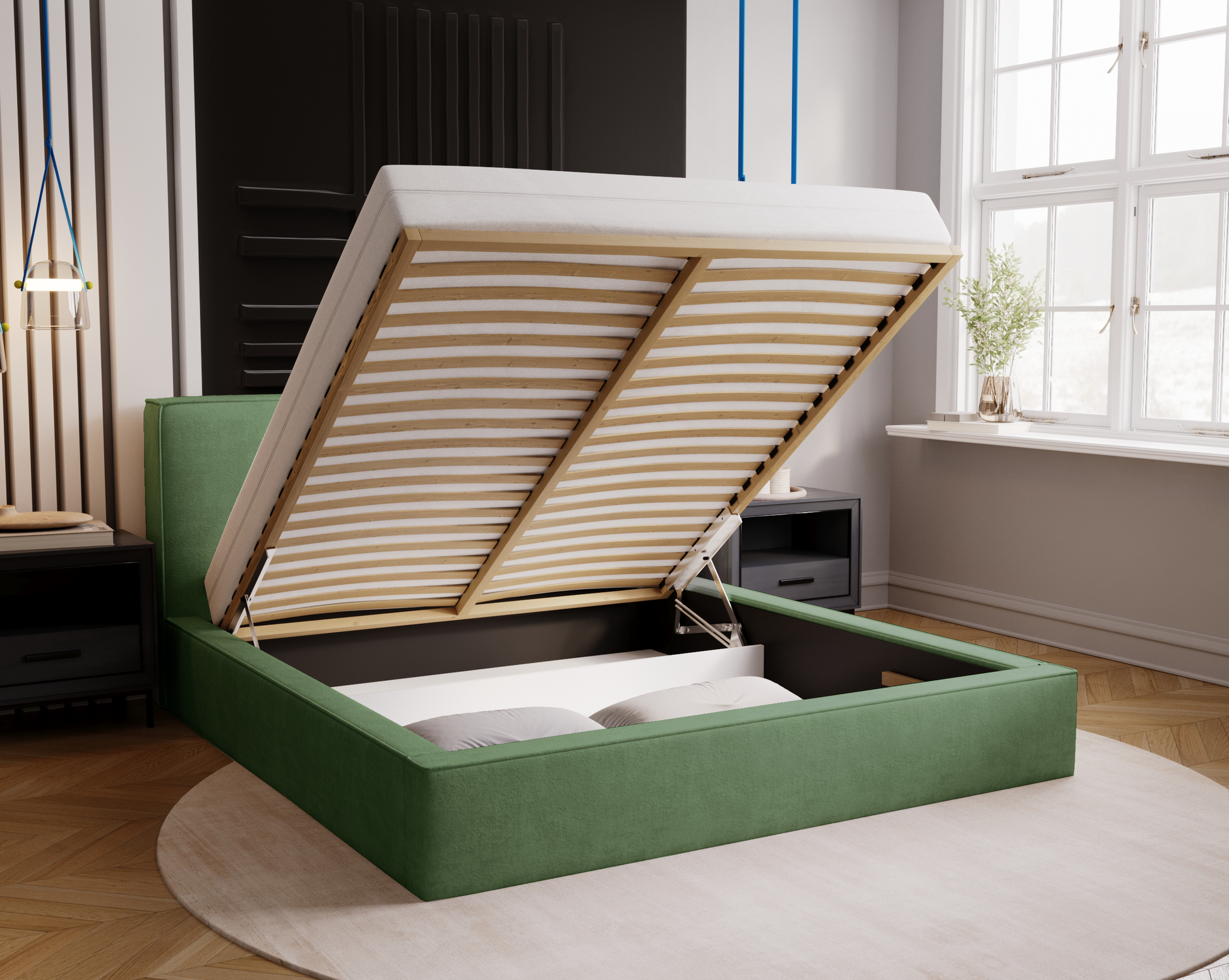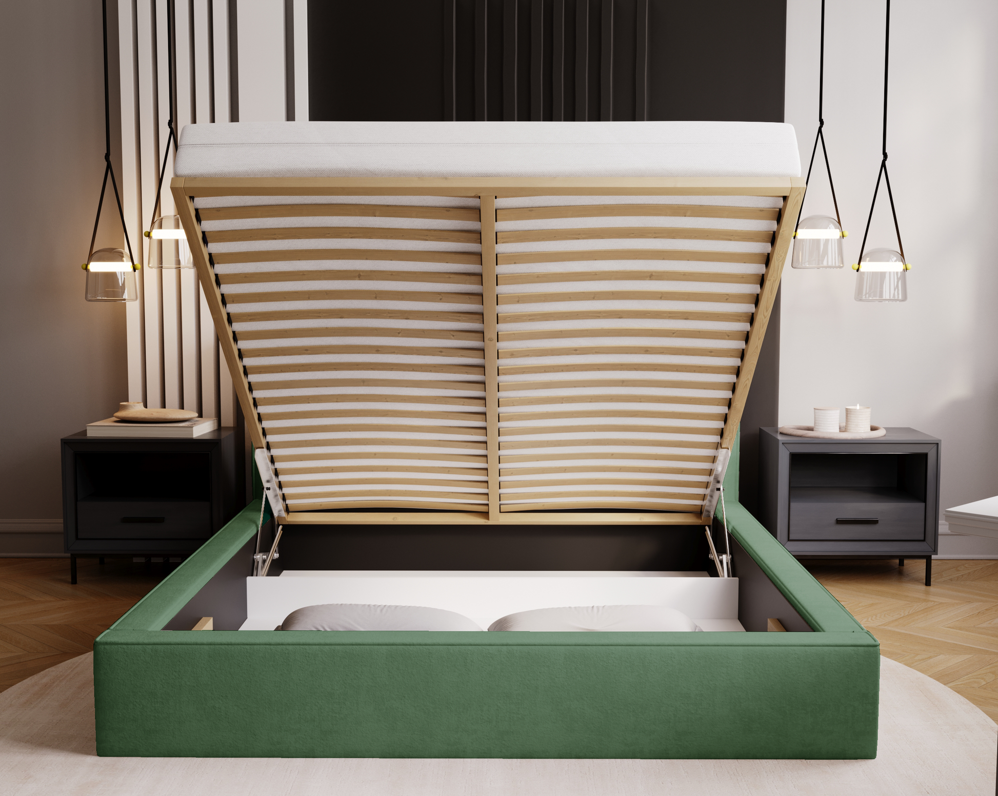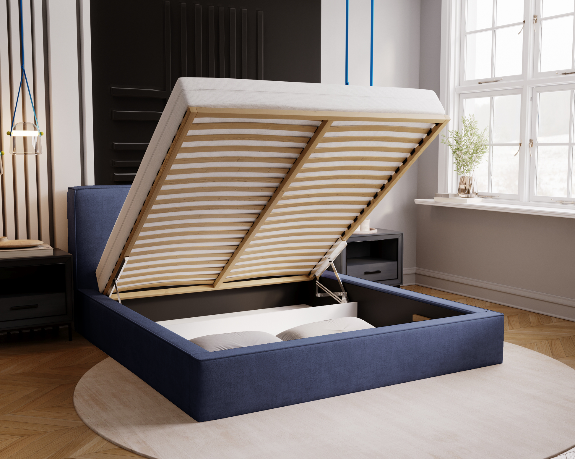Under madrassen gömmer sig en rymlig förvaringslösning – perfekt för att hålla ordning på extra täcken, sängkläder och annat du vill ha nära men inte synligt. Med sitt enkla lyftsystem når du enkelt det du behöver.